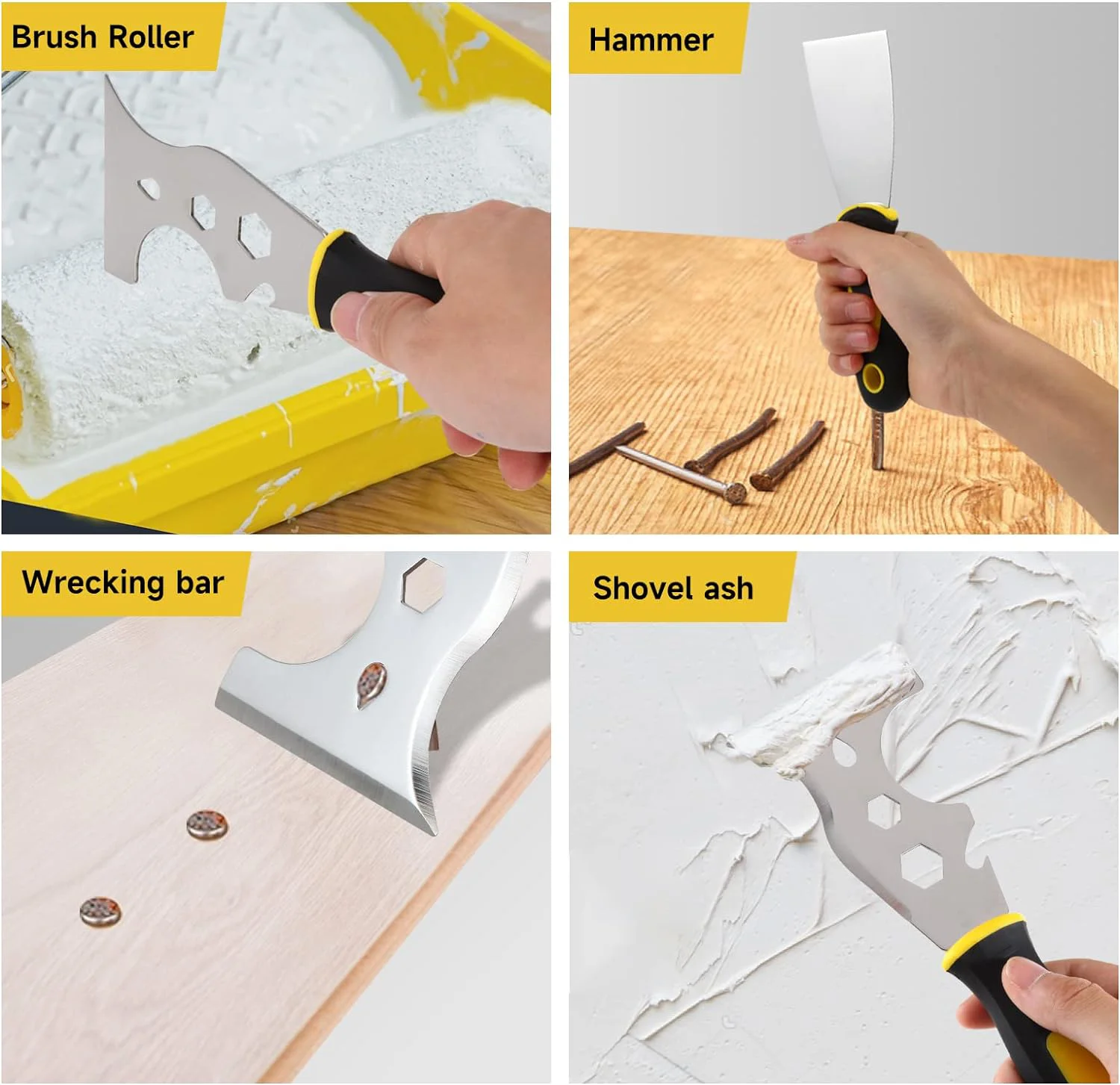 【15-in-1 Painters Tool】The versatile tool can be used as a straight scraper, curved scraper, gouger, screwdriver, nail puller, can opener, hammer, roller cleaner, box opener, pry, Allen wrench & more.