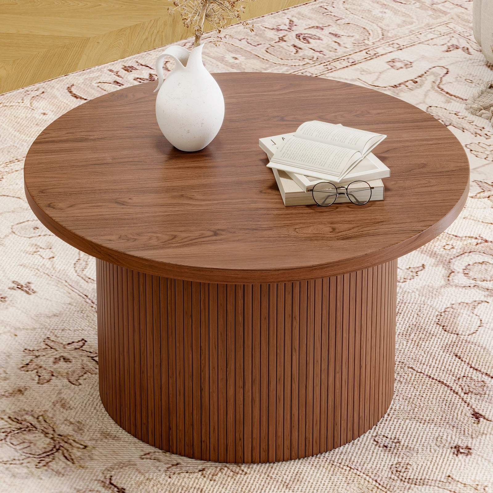 31.5" Round Coffee Table,Tambour Design Coffee Tables for Living Room,Mid Century Modern Wood Coffee Table,Drum Accent Small Center Table,Walnut