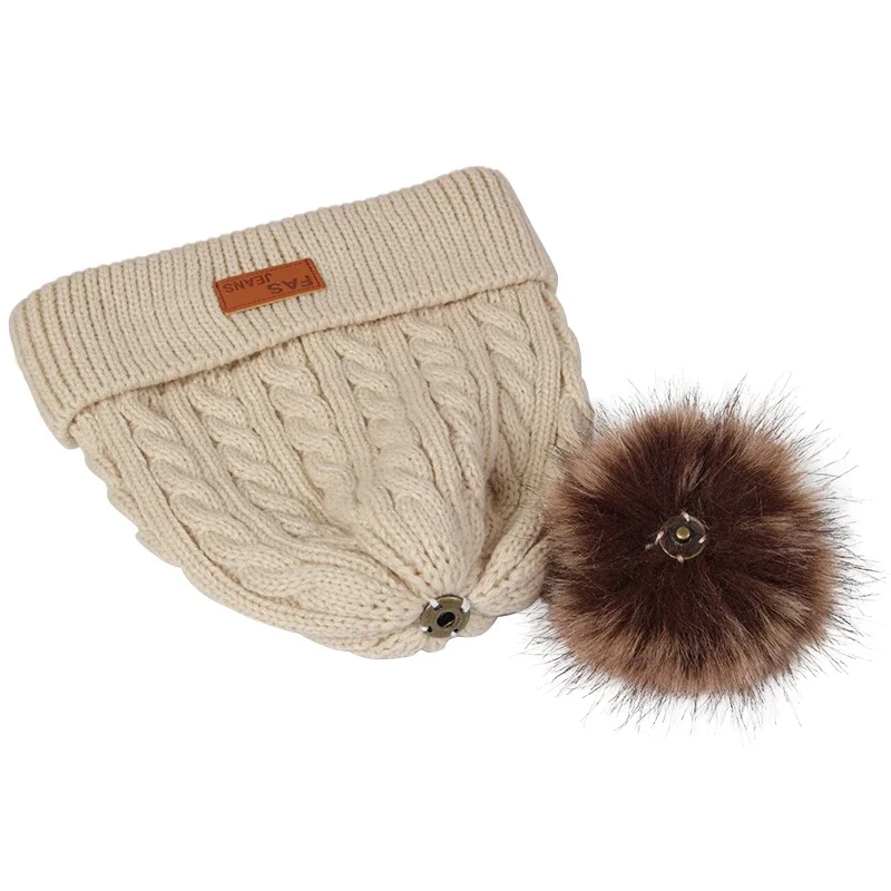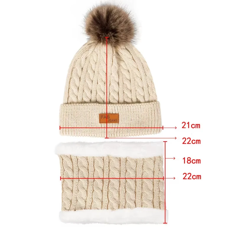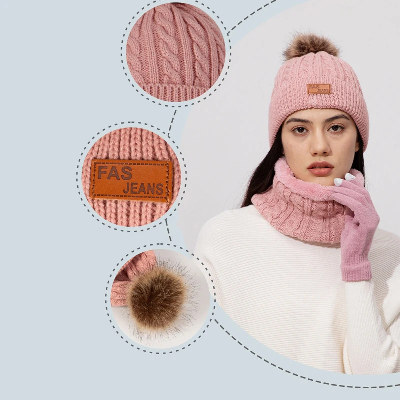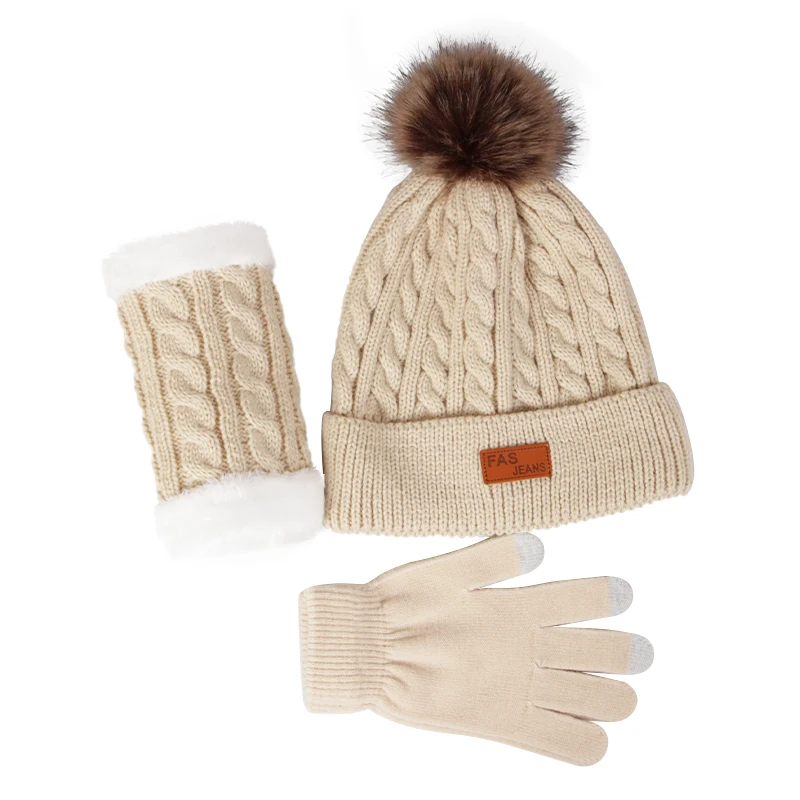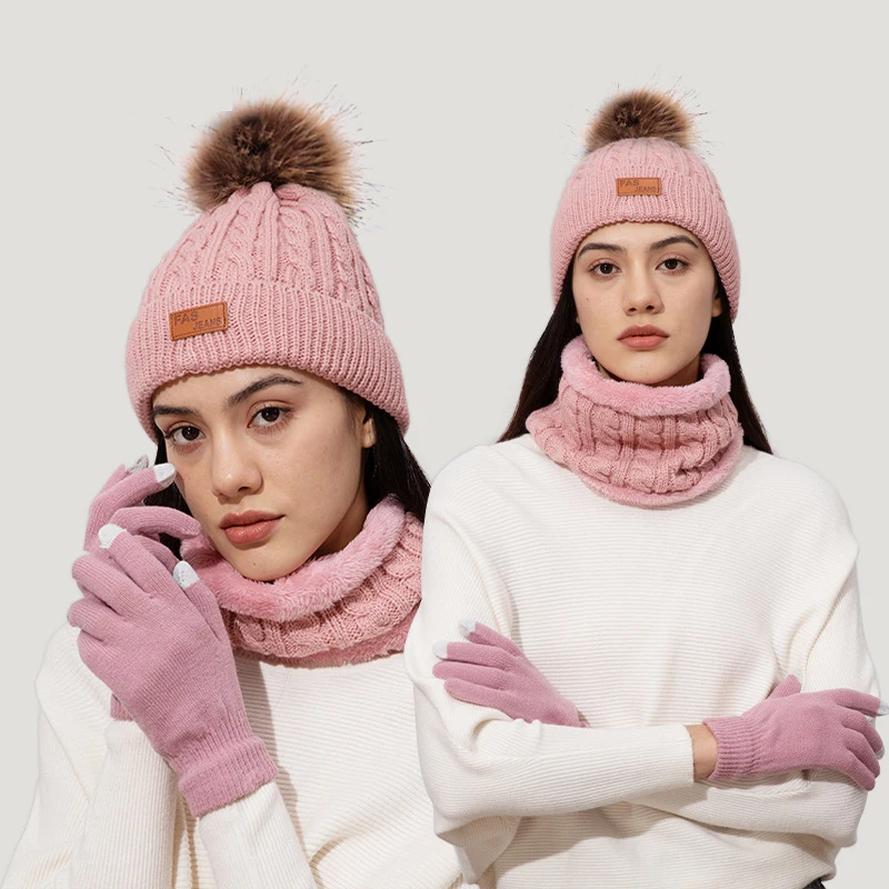 3Pcs/Set Women Winter Hat Scarf Gloves Faux Fur Ball Teenager Girls Knitted Beanie Neck Warmer Suit Warm Ears Woman Cap Set