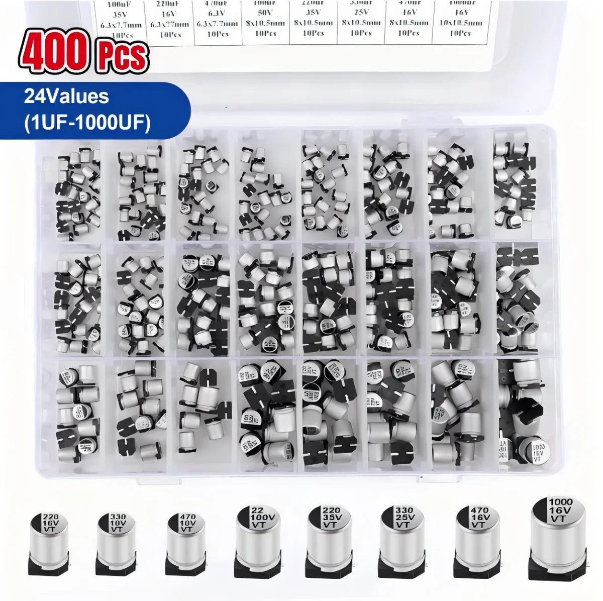400PCS/145PCS capacitor kit Aluminum Electrolytic SMD condensadores electrolíticos 1uF~1000uF 6.3V-50V 24Value with box kit