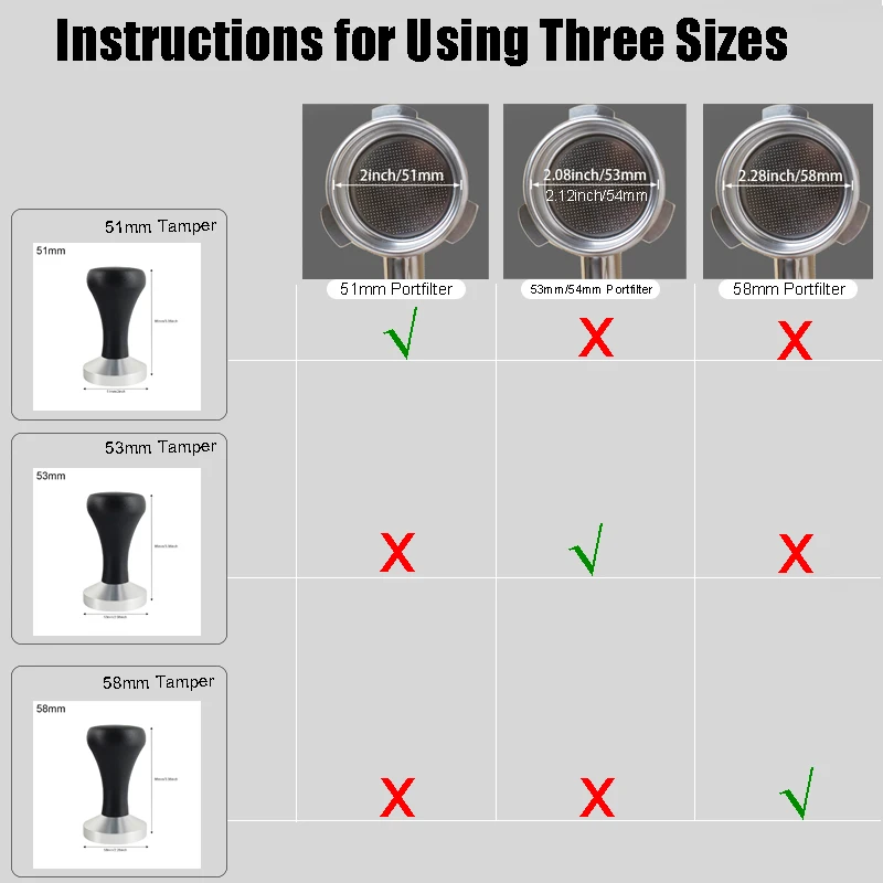 Tamper Size: Diameter 51mm/2inch, 53mm/2.08inch, 58mm/2.28inch. High:86mm/3.38inch.