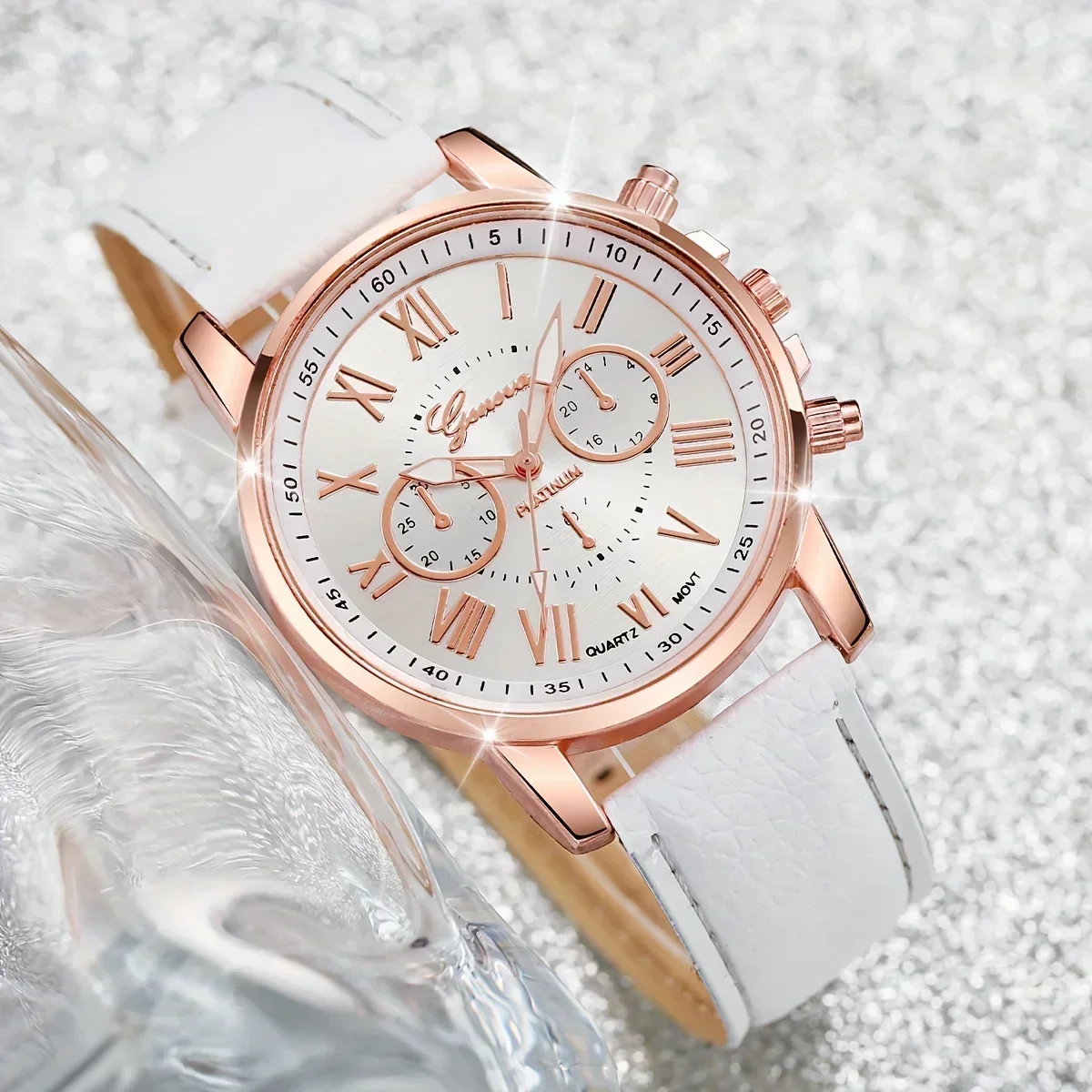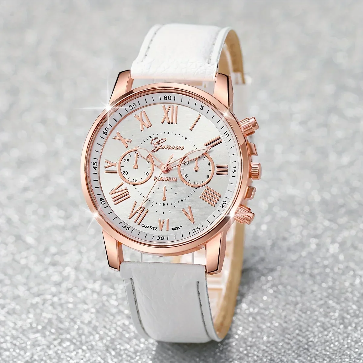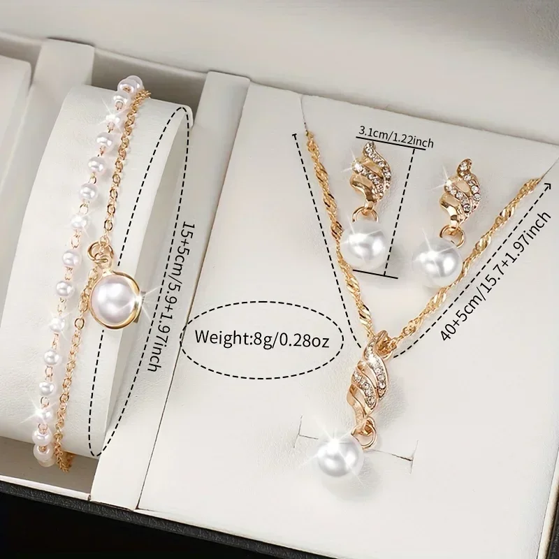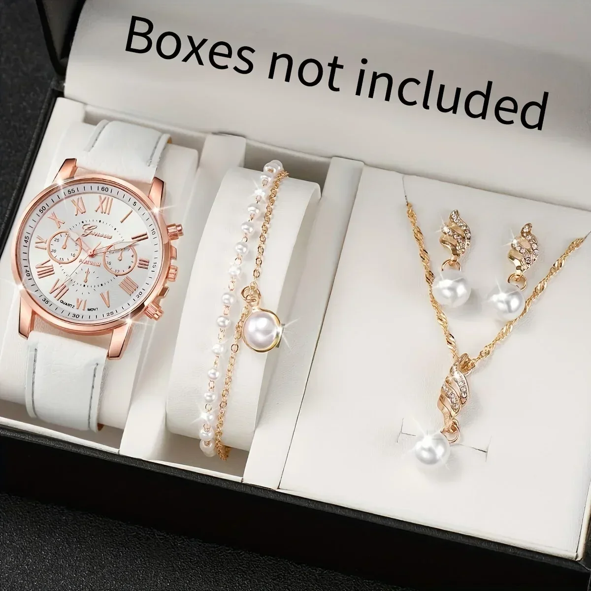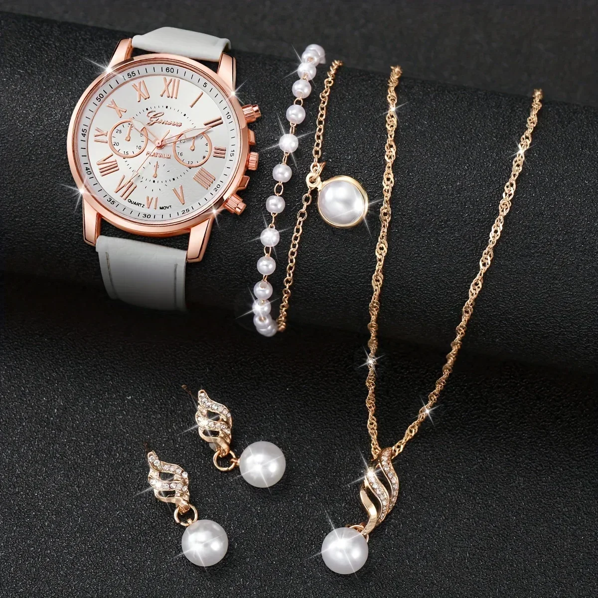 5pcs/set Women’s Watch Casual Round Pointer Quartz Watch PU Leather Wrist Watch & Faux Pearl Jewelry Set, Gift For Mom Her