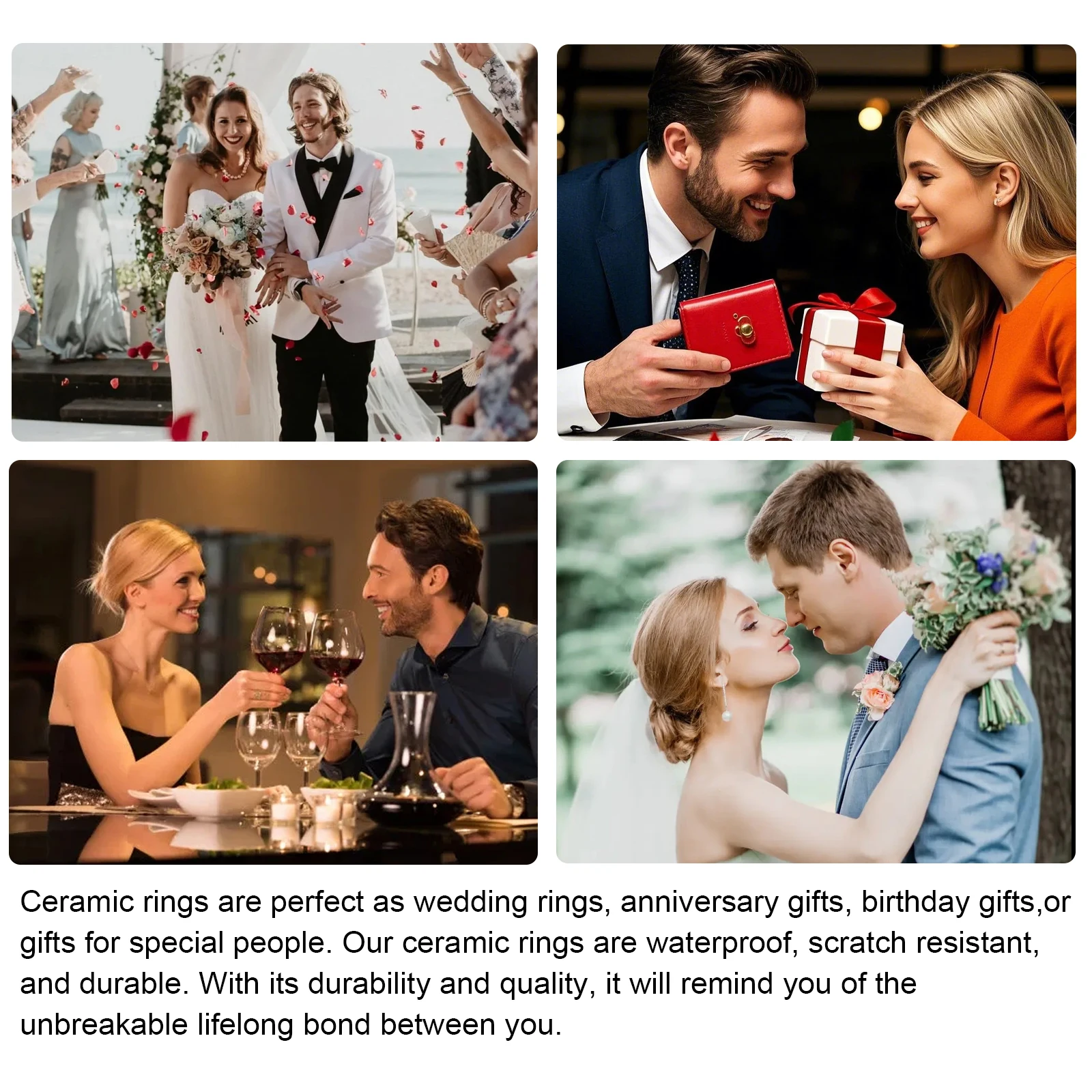 Our ceramic rings are an ideal replacement for traditional precious metal jewelry because they look fashionable, wear more comfortably, and are affordable,In addition, our fashionable rings are excellent gifts for weddings, engagements, anniversaries, parties, birthdays, Valentine's Day, Thanksgiving, and Christmas for both men and women.
