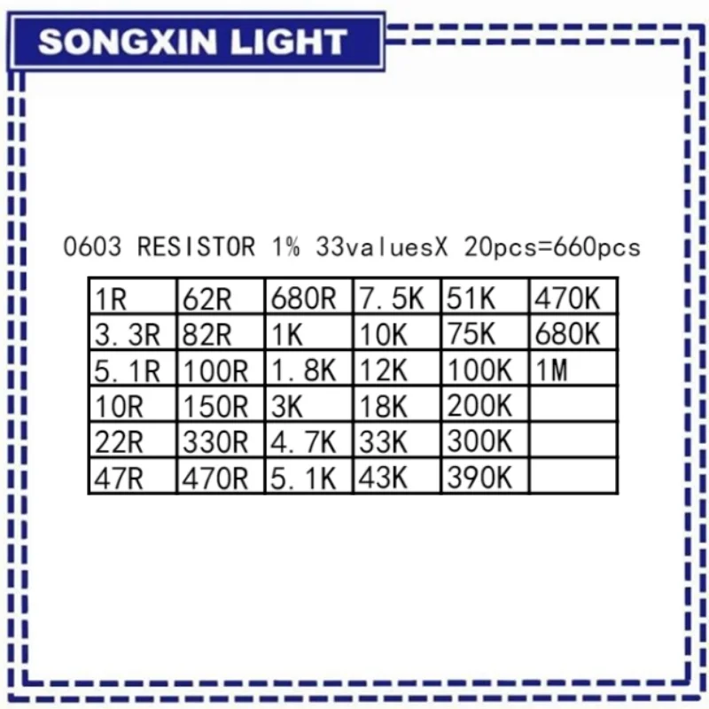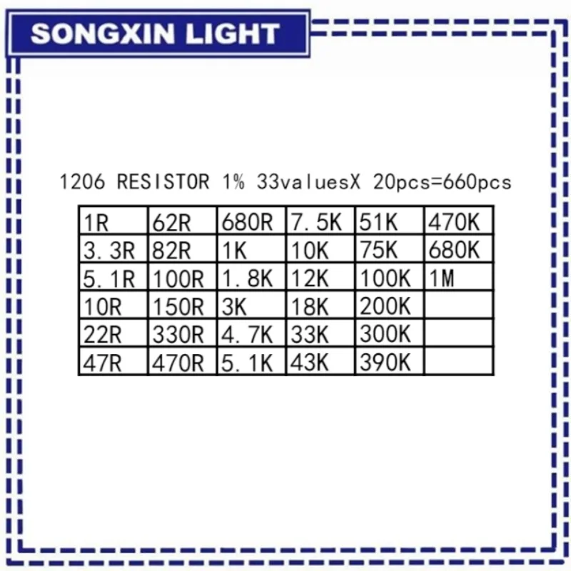660PCS PLR 0201 0402 0603 0805 1206 1% SMD Resistor Assorted Kit 33Values Each 20pcs 1R-1M 10K 100K 1K 100R Resistance Set