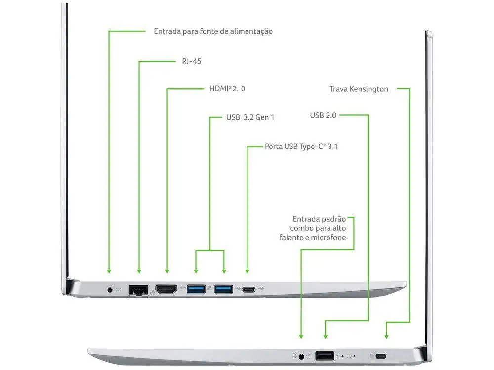 Áudio: 2 Alto-falantes estéreo de 2W cada. Tecnologia AcerTrueHarmony gen 2. 2 Microfones. Tecnologia Acer Purified Voice