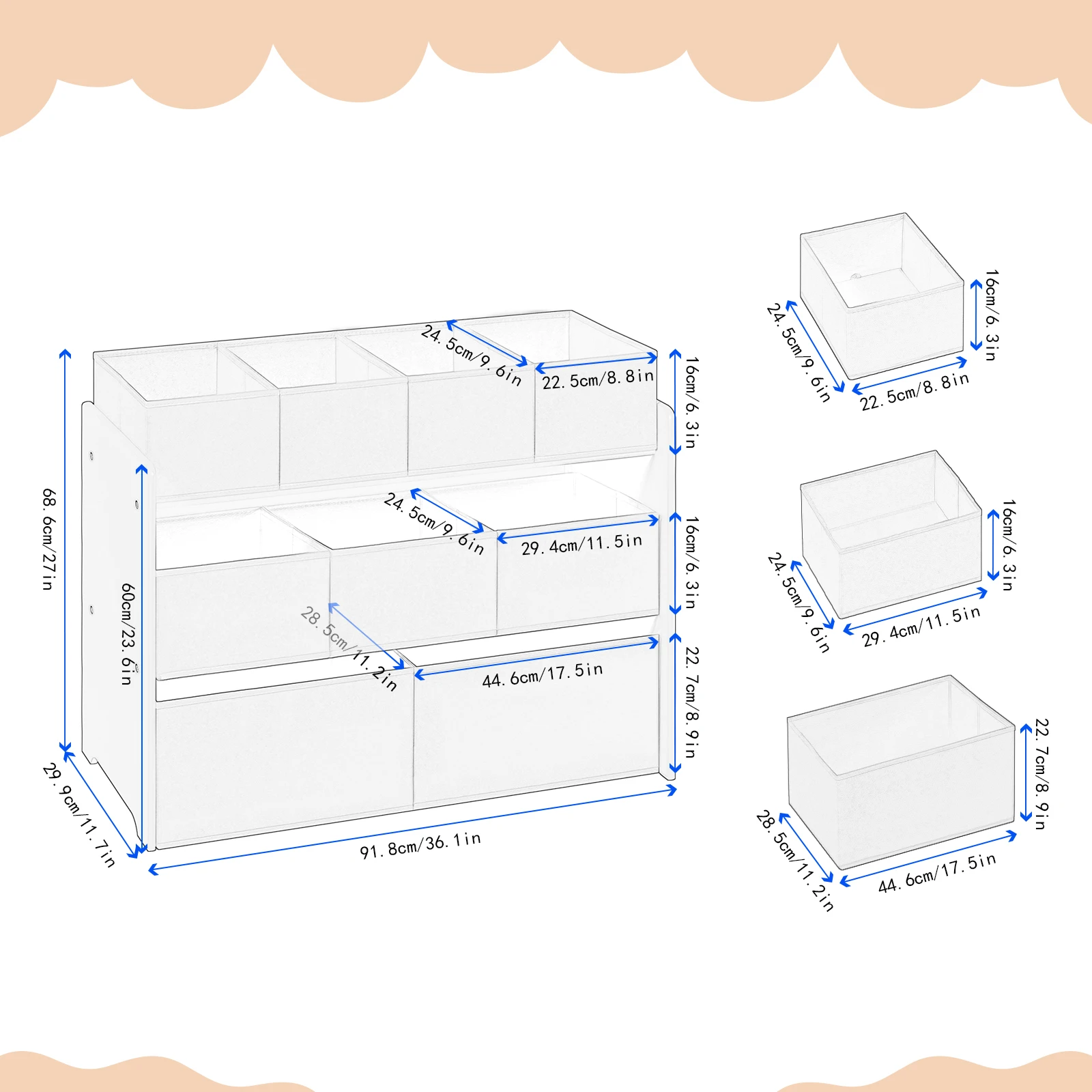 LARGE STORAGE SPACE The kids shelf has 9 removable non woven fabric toy boxes in 3 sizes. They provide ample storage space so children can sort their toys and snacks and keep the play or bedroom tidy