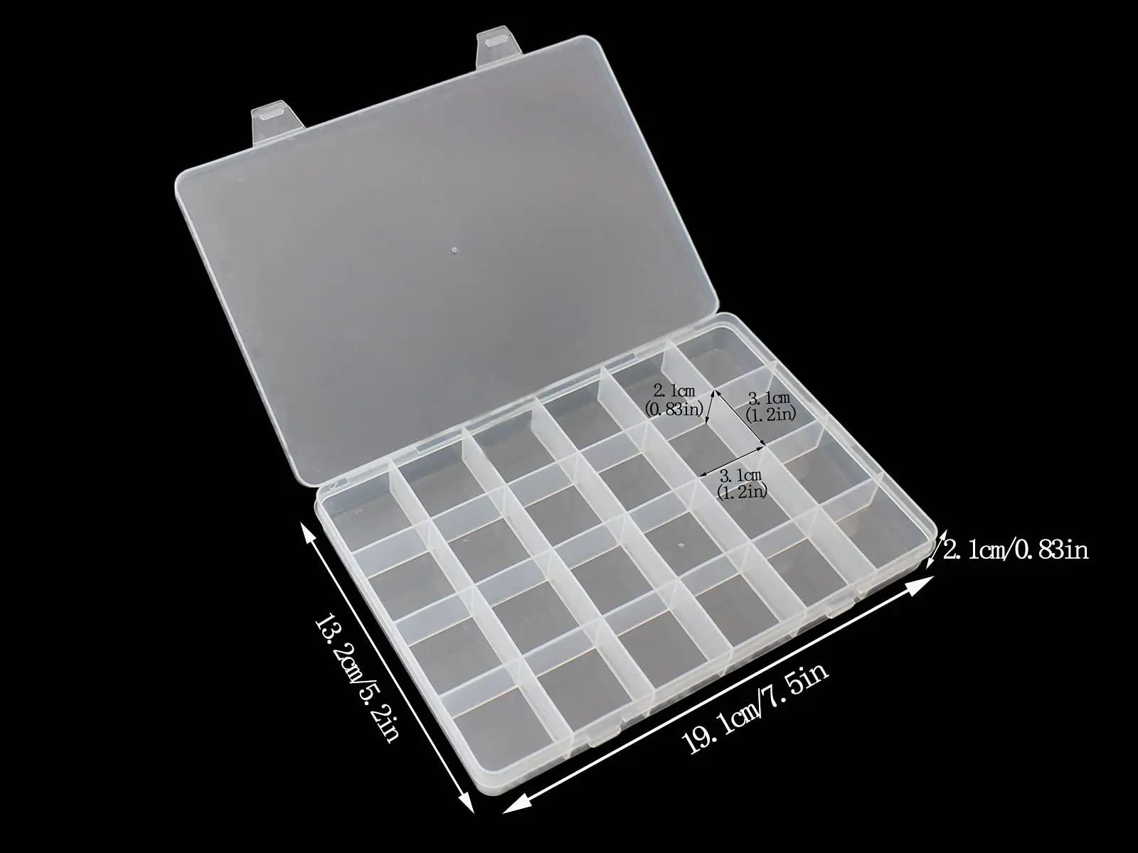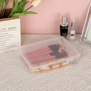 Plastic Craft Storage Box: Measures by 12.8"x9.3"x2.1" (LxWxH); and interior size is 12.2"x8.6"x1.8" (LxWxH). This size is just right for A4 file papers, can hold lots of pencils and markers. There are three sizes for you to choose from.