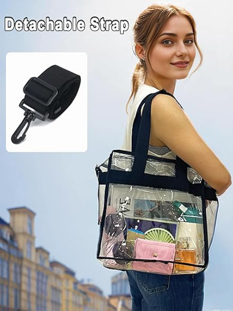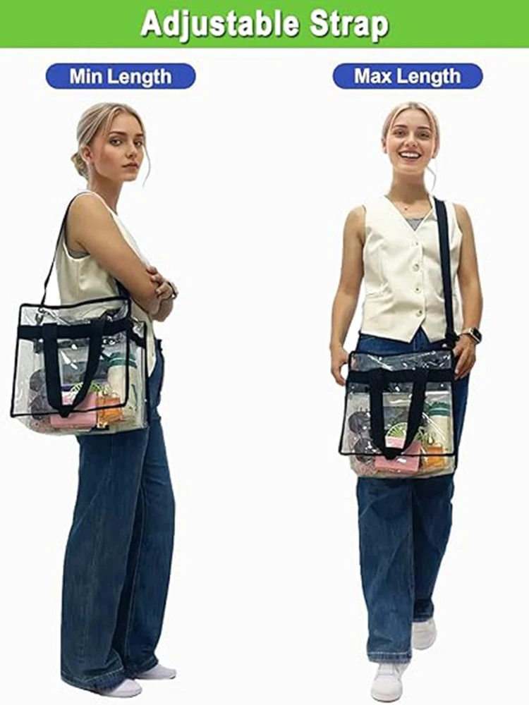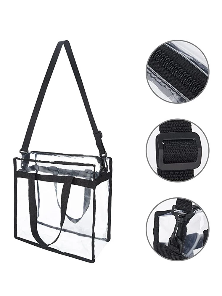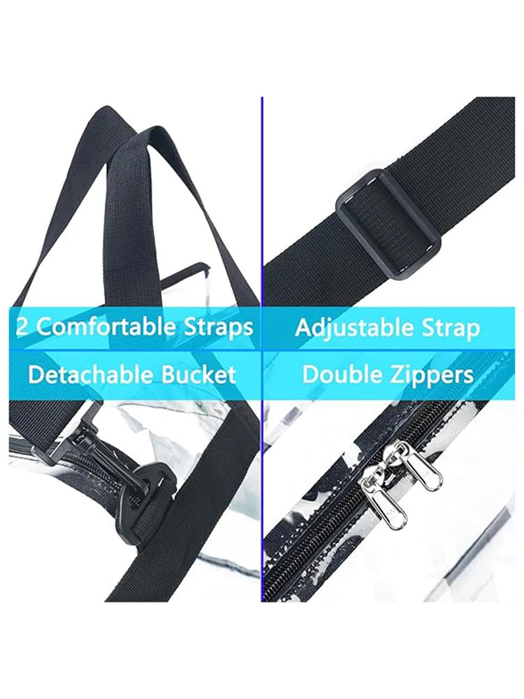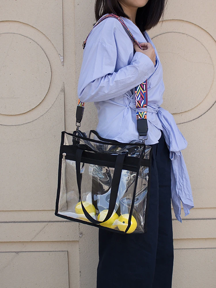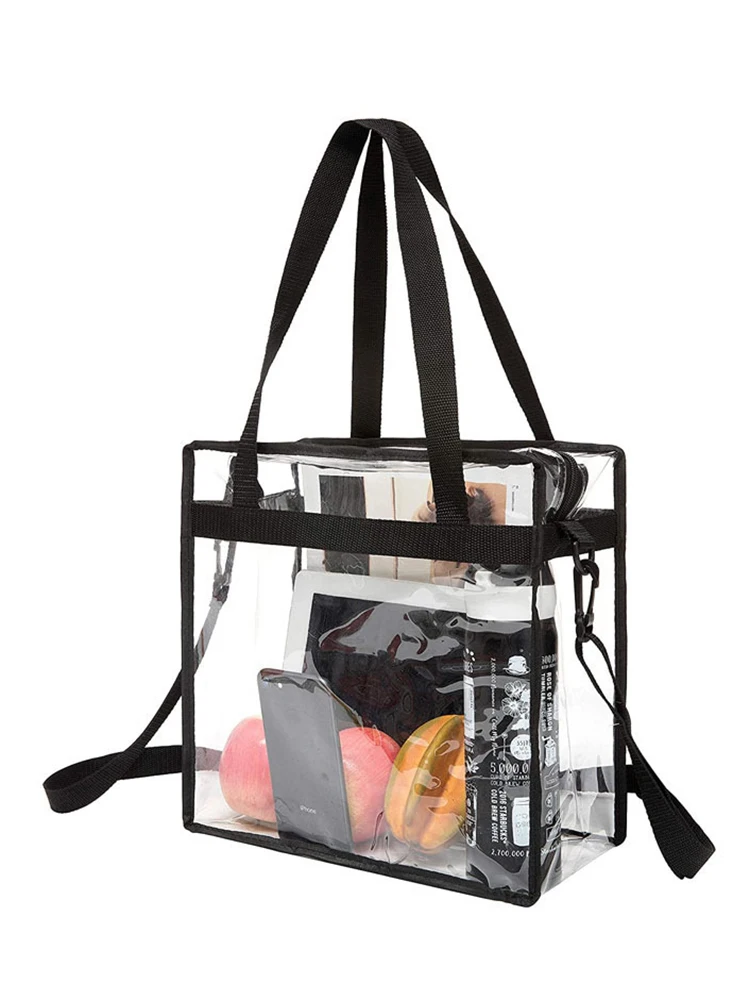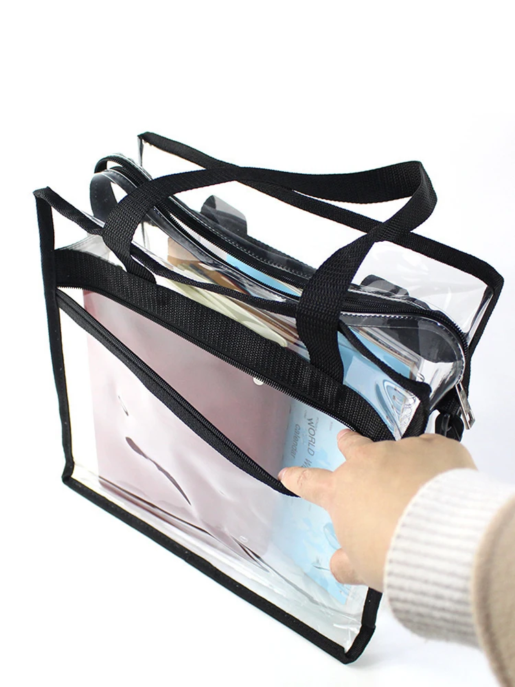 This Clear PVC Tote Bag offers ample storage space, perfect for gym essentials, swimming gear, or travel items.