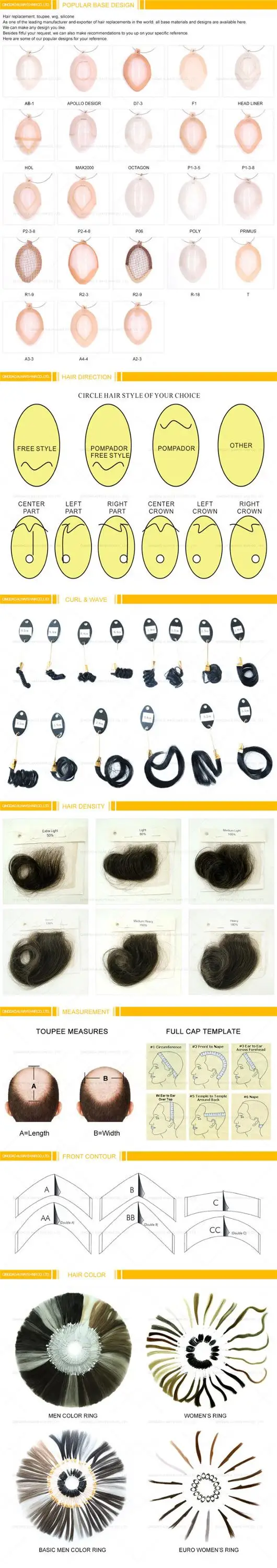 For custom orders,any design and material are ok to order. Client usually send us template and hair sample , we offer them the best fitting products .