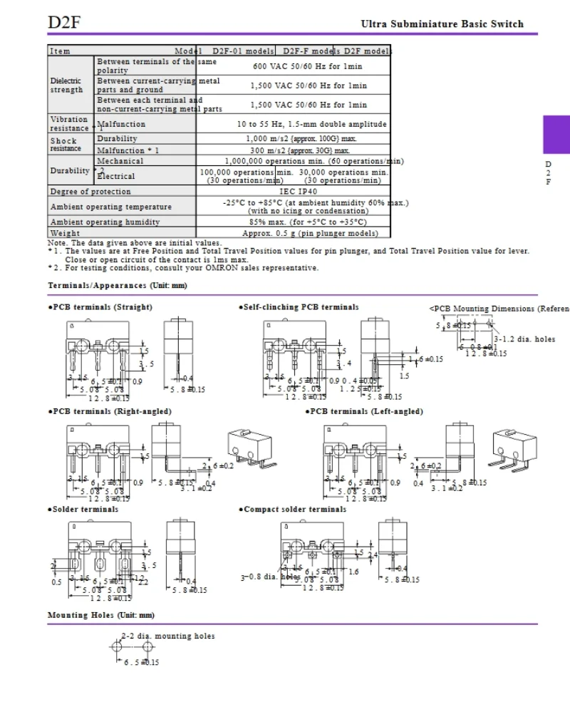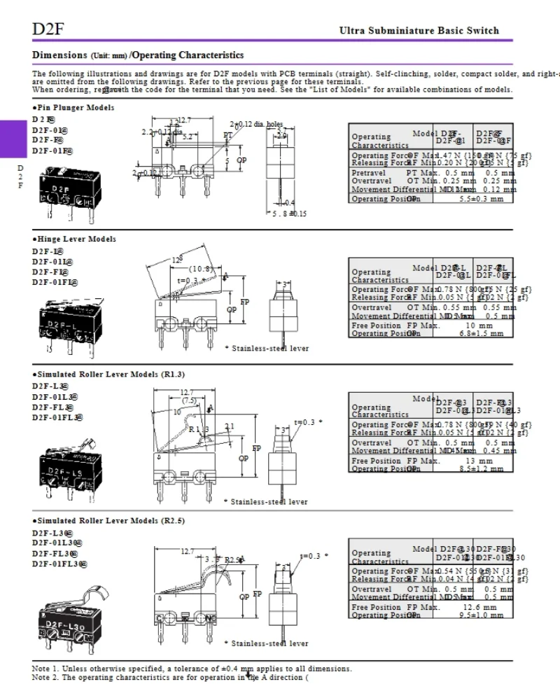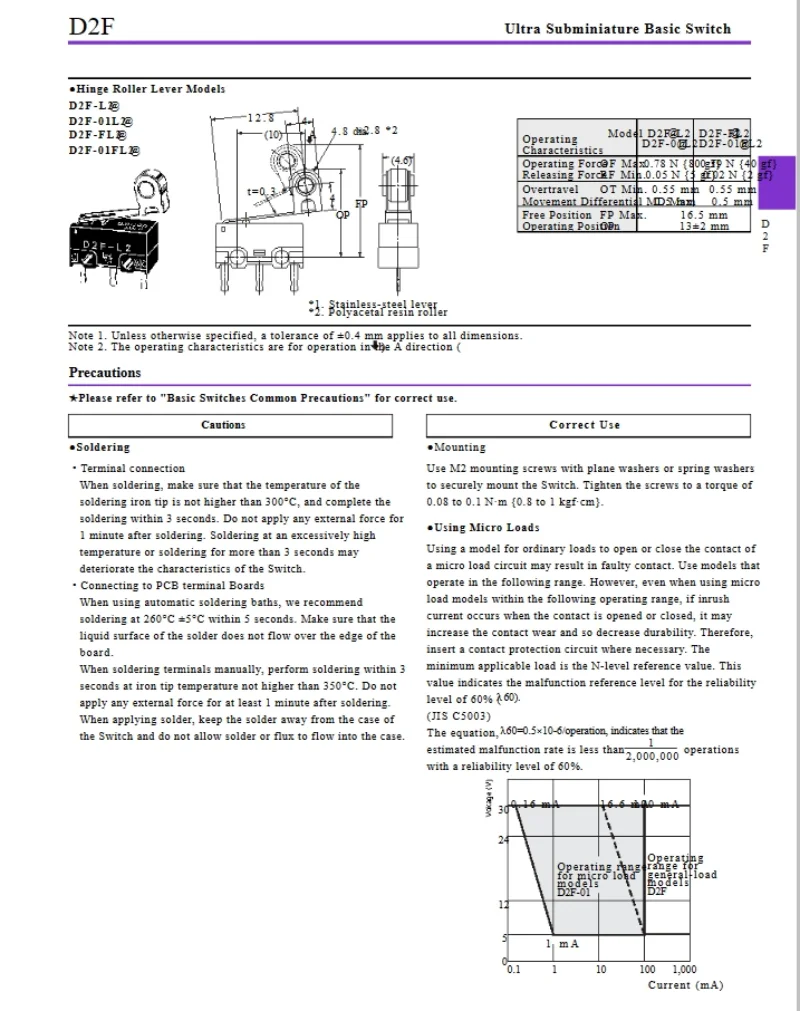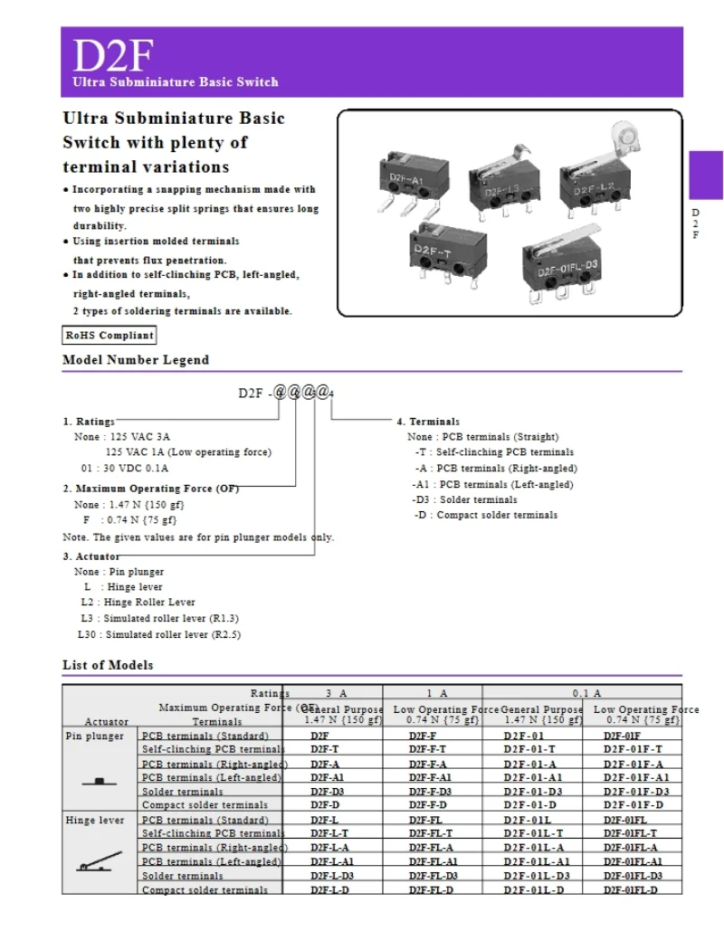 D2F – F-3-7 Snap Action N.O./N.C. SPDT Pin Plunger 3A 125VAC 30VDC 1.47N Travel micro switch for Omron mouse switch