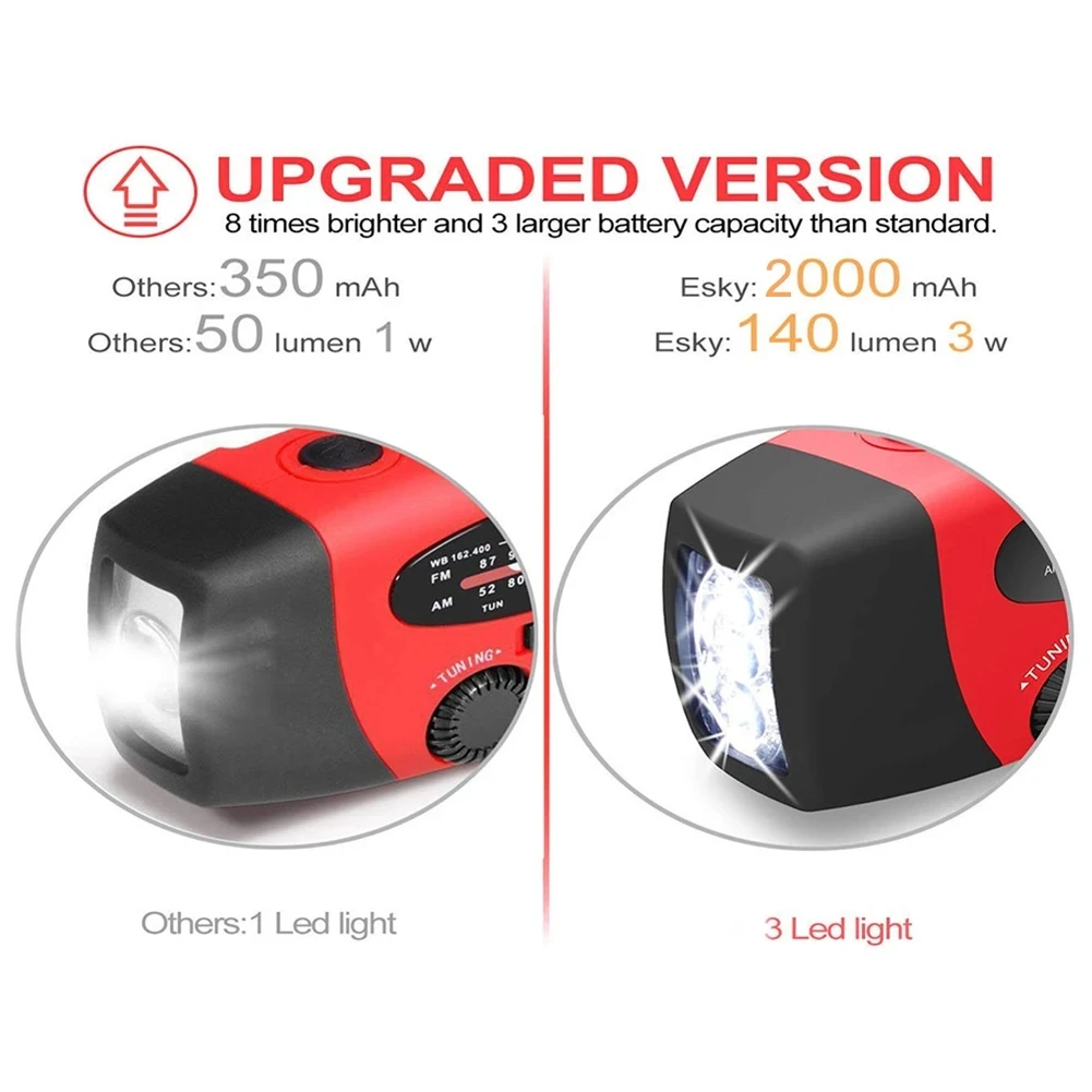 2. Multifunctional: Weather Radio,3 LED flashlight,power bank
