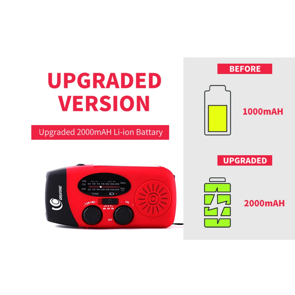 3. Three charging methods. USB, solar, manual charging. Rechargeable radio is always available! The powerful 2000mAh battery can be charged via a USB cable, solar panel or hand crank.