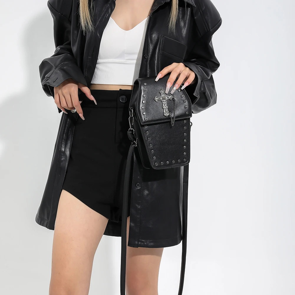 Women Coffin Crossbody Purse Gothic Y2K Coffin Cellphone Tote Bag Skull Shoulder Bag PU Leather Halloween Versatile Bag Features: 1.Quirky Design: Stand out from the crowd with this stylish and quirky Halloween-themed coffin-shaped crossbody bag for women. Its unique design is sure to catch attention and ignite conversations wherever you go. 2.Easy Maintenance: This fashionable coffin satchel purse is made from soft and comfortable PU fabric, ensuring a pleasant tactile experience. Additionally, the material is easy to clean and maintain, making it perfect for everyday use. 3.Compact Size: Despite its compact dimensions of 140mm x 65mm x 220mm, this skull gothic shoulder bag provides enough space to accommodate your wallet, phone, keys, and other small essentials. Stay organized while enjoying the convenience of a portable and practical accessory. 4.Versatile for Various Occasions: Whether it’s shopping, traveling, vacationing, or attending parties, this cross crossbody pouch is suitable for a wide range of occasions. It effortlessly complements different outfits and adds a touch of fun and style to any event. 5.Perfect Gift : Ideal for Halloween, women’s birthdays, holiday parties, or any special occasion, this y2k cellphone bag makes for a perfect gift. Surprise your friends, girlfriends, wives, mothers, and loved ones with this sweet and trendy accessory.