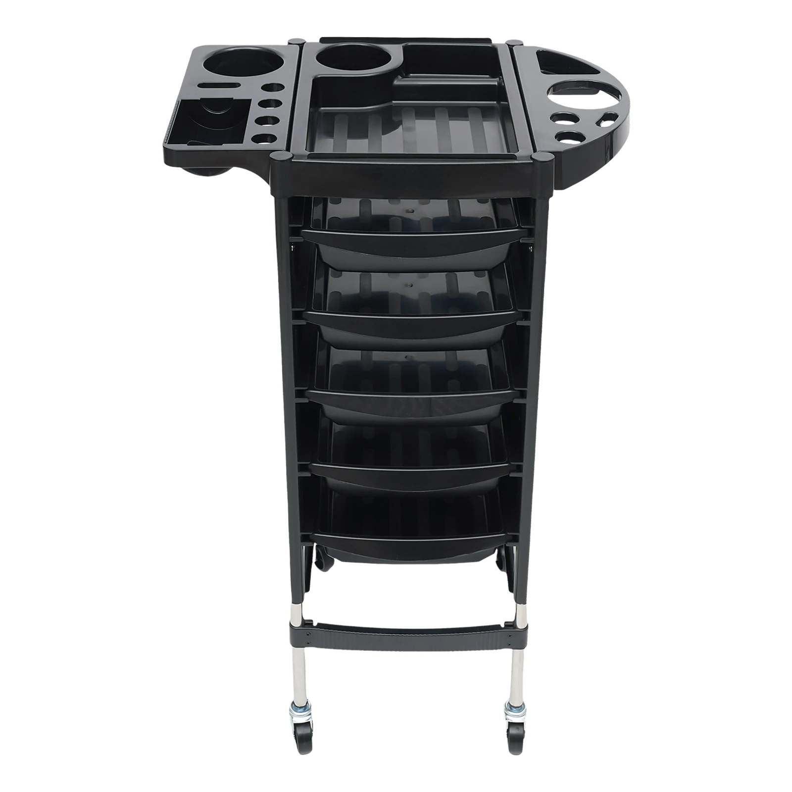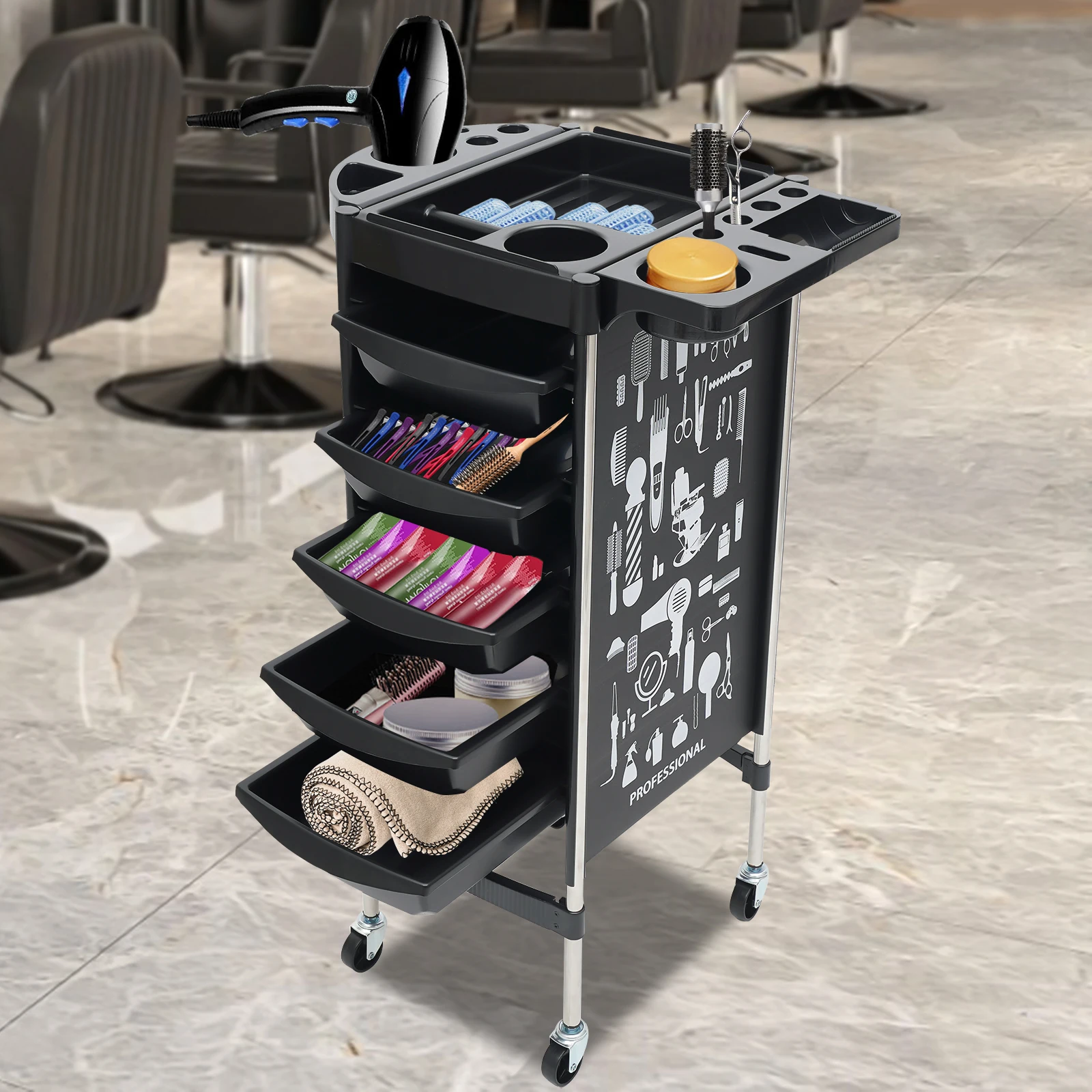Large capacity: the trolley is equipped with 6 shelves and 5 drawers, which provide plenty of storage space and allow you to categorise and store the different hairdressing tools and products accordingly, making the items easier to find and the salon tidy.