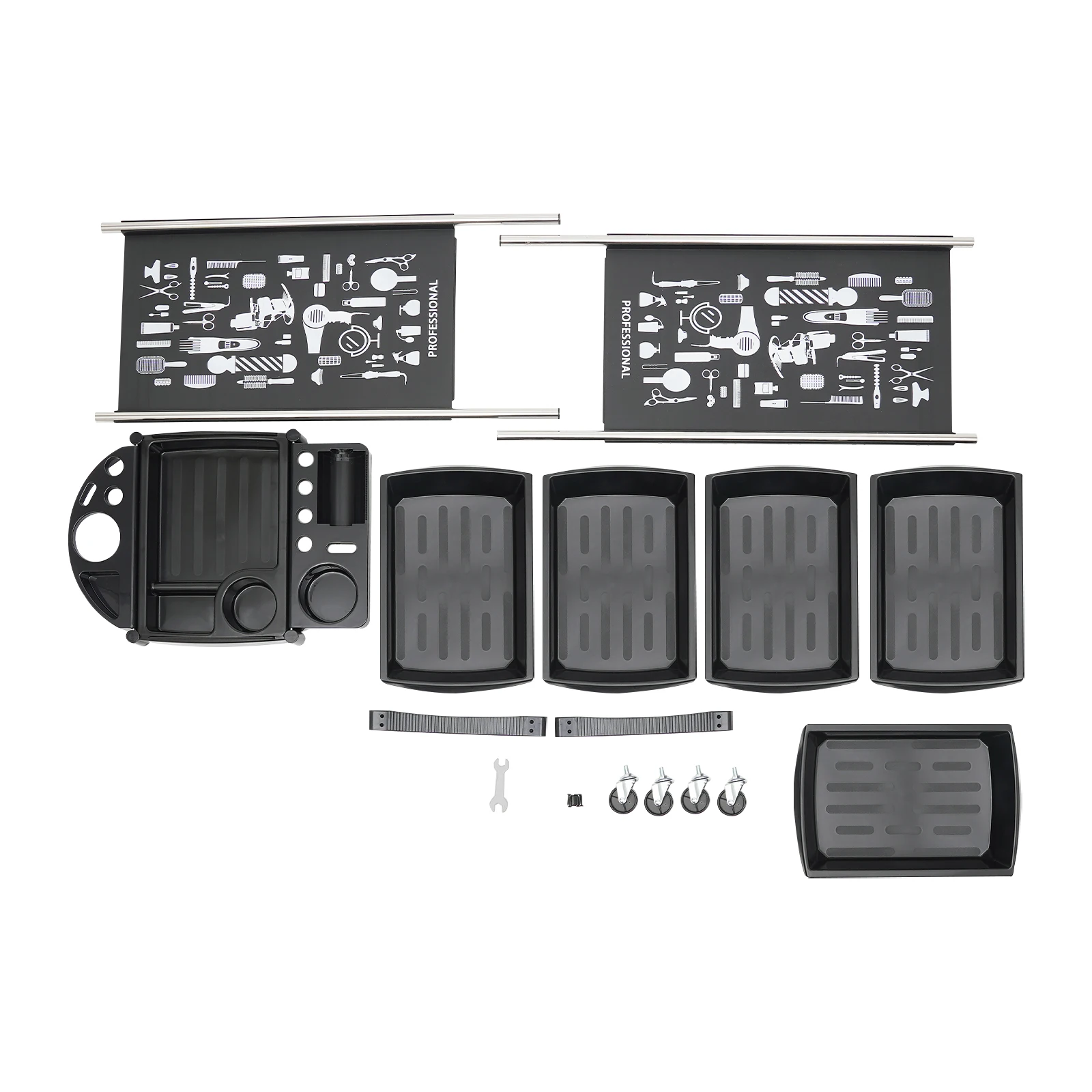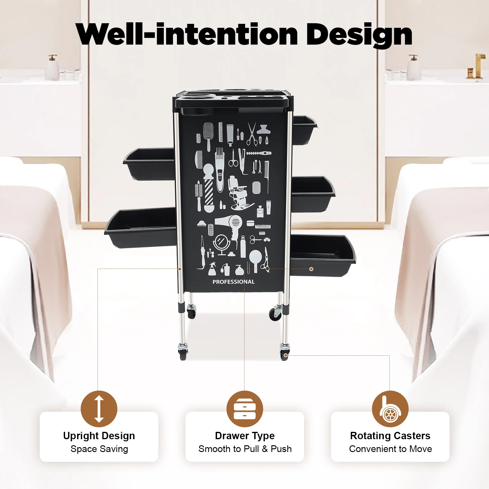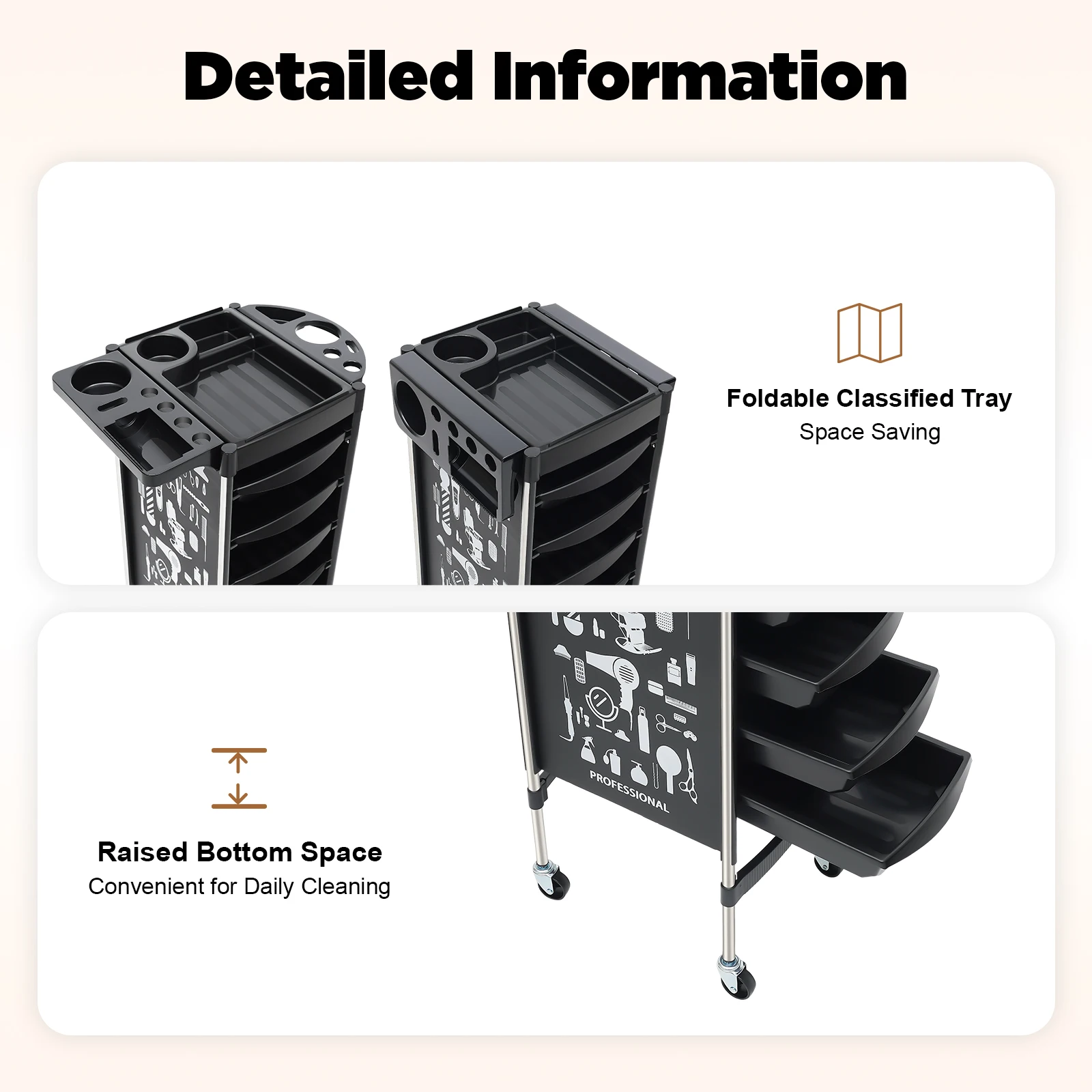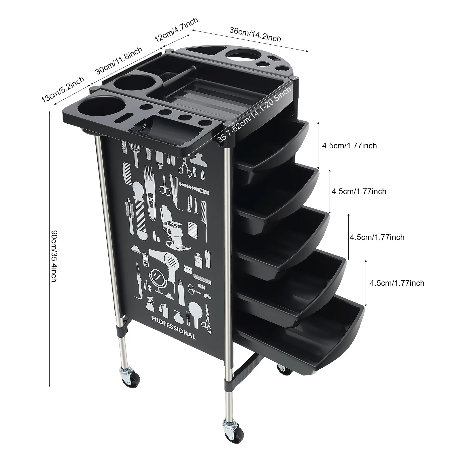 Multifunctional platform: On the top of the trolley there is a multifunctional platform that can be used to store hair dryers, scissors, dye trays, spray bottles and other commonly used hairdressing tools, which you can easily access at any time during the hairdressing process.