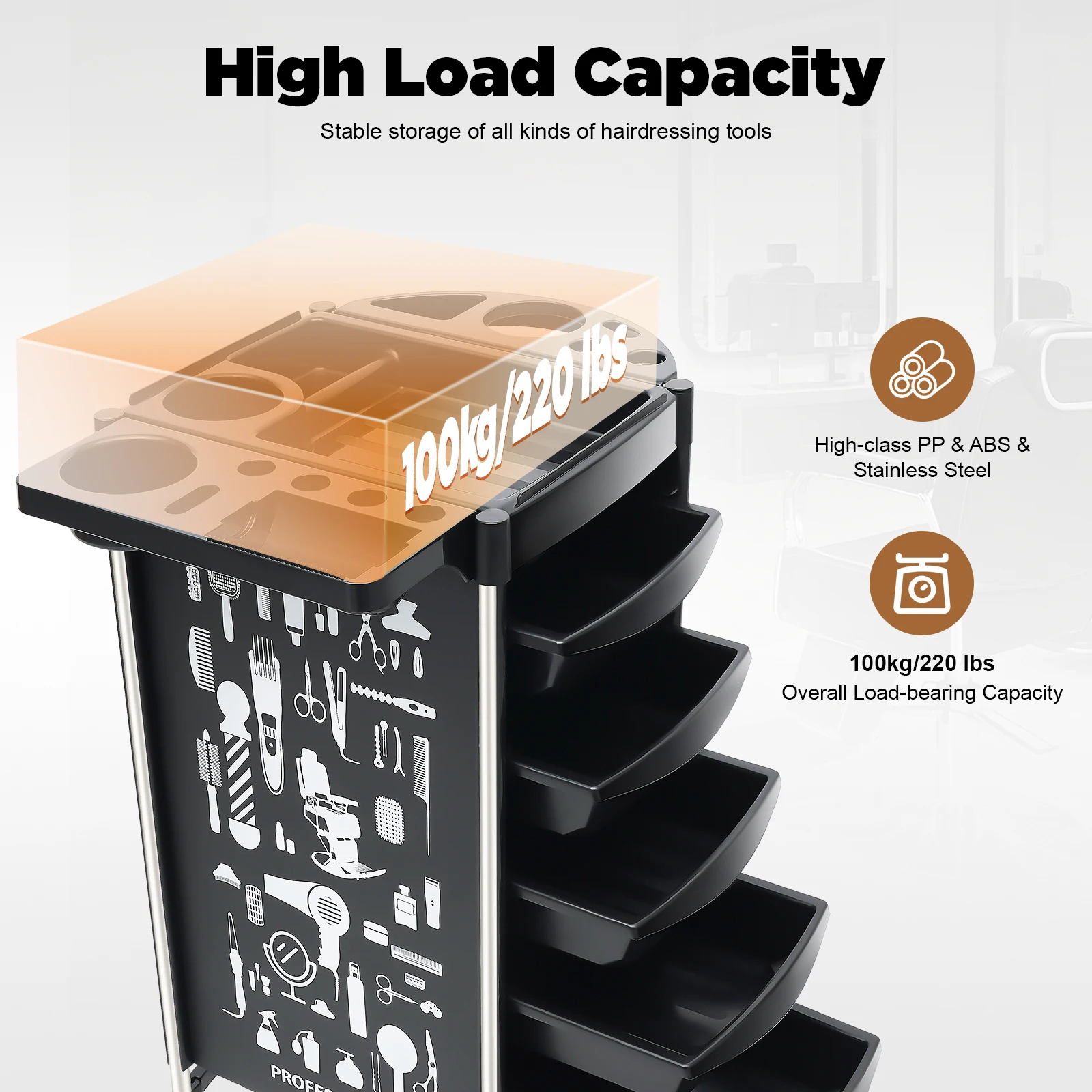 Stable: The hairdressing trolley has stainless steel brackets and base reinforcements that allow it to withstand weights of up to 100 kg, which ensures stability and solidity of the stored items.
