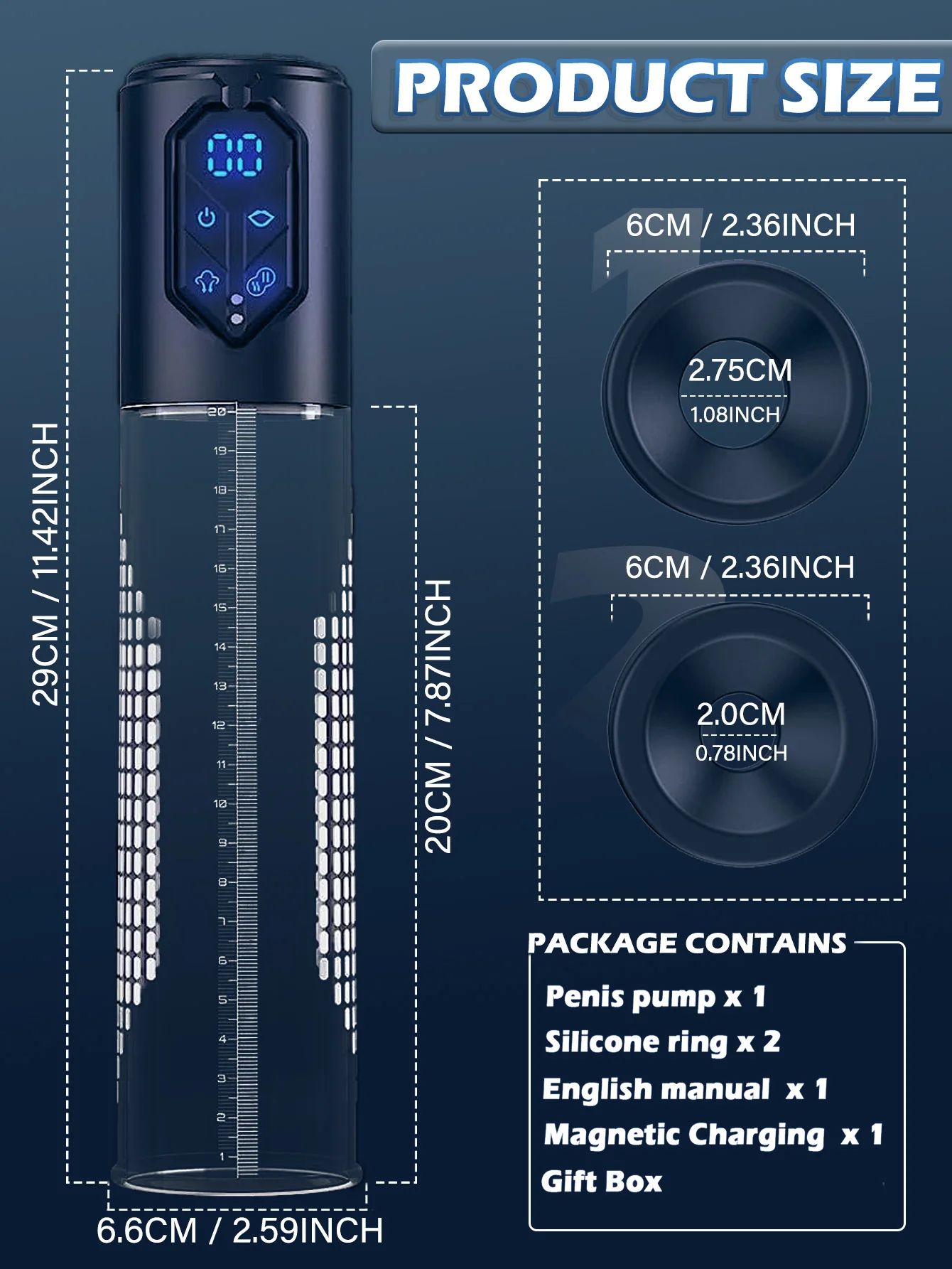 4 different suction intensities: the pumps have 4 selectable suction levels, including a constant pressure mode with 1-3 levels and the intelligent suction mode with 3 levels. After you turn on this men's sex toy, you can select the desired training mode for enlargement by touching the LCD display.