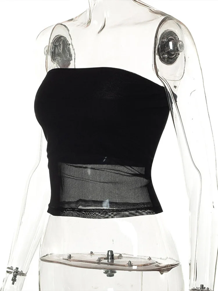 Mesh Corset Black Crop Top Women Patchwork Tube Top Sexy Sleeveless Off Shoulder Cami Summer Streetwear Slim Strapless Tank Tops