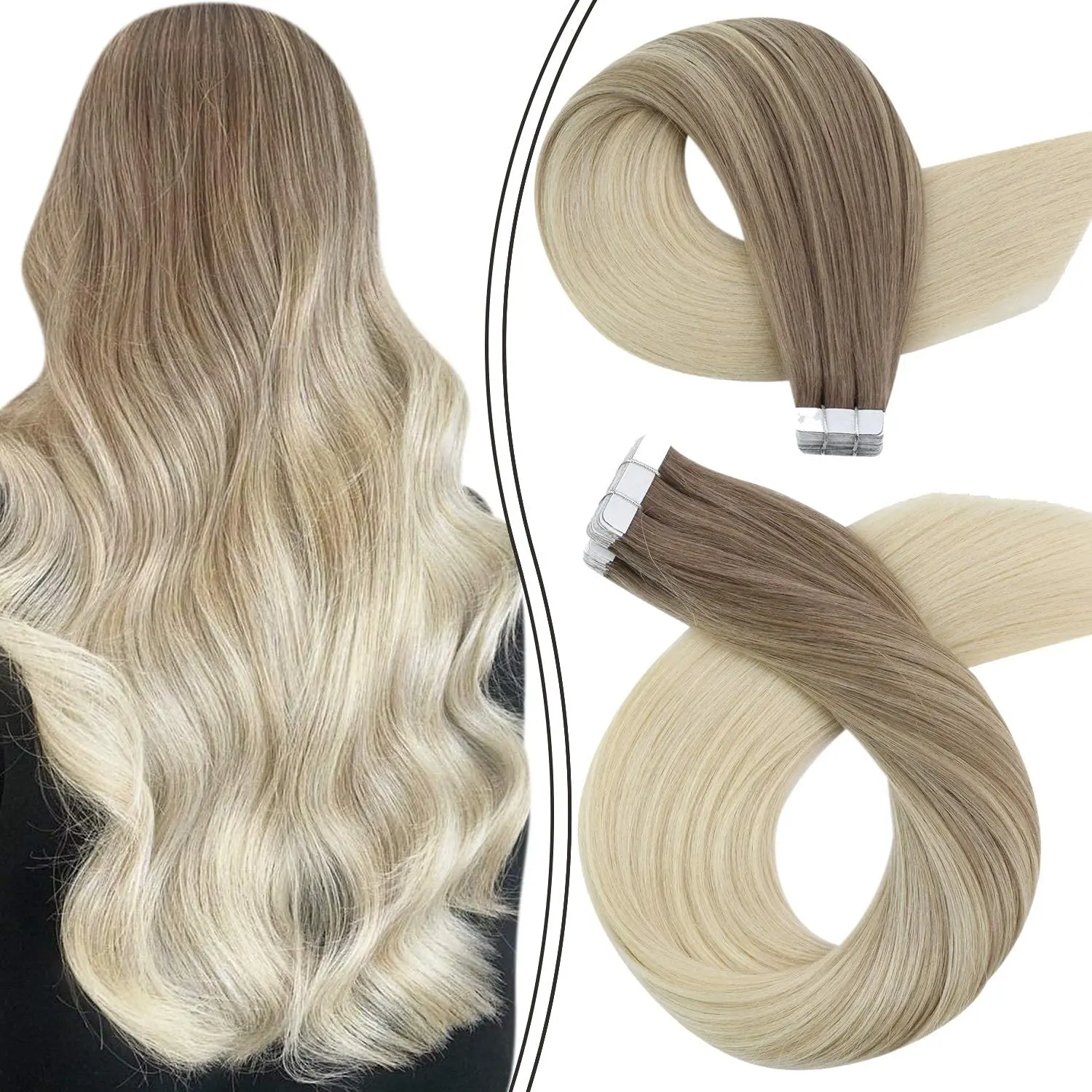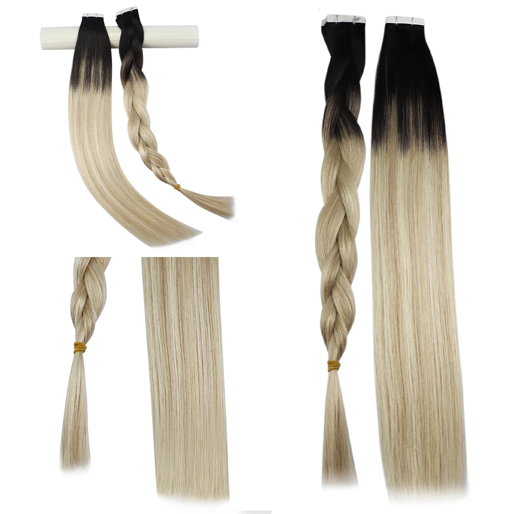 2. Tape one piece of hair extensionunder sectioned hair abour 1/4 inch from the scalp, and peel the tape cover off.