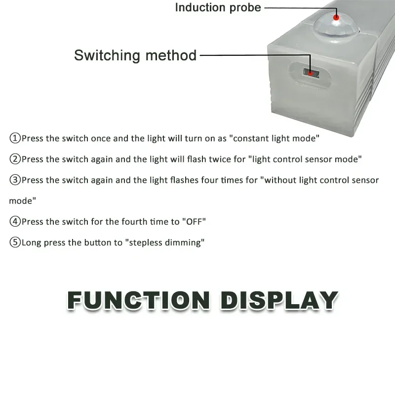 ①Short press the first time, white light induction mode, in this mode, long press for 2 seconds for constant white light, short press again to turn off