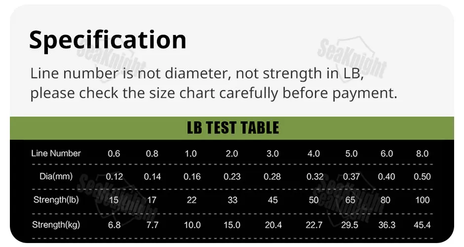 2 Line number is not diameter, not strength in LB,please check the size chart carefully before payment, and please leave us message if anything confused, thanks! For eaxmple, line number 0.8, strength is 17lb, diamter is 0.14mm.