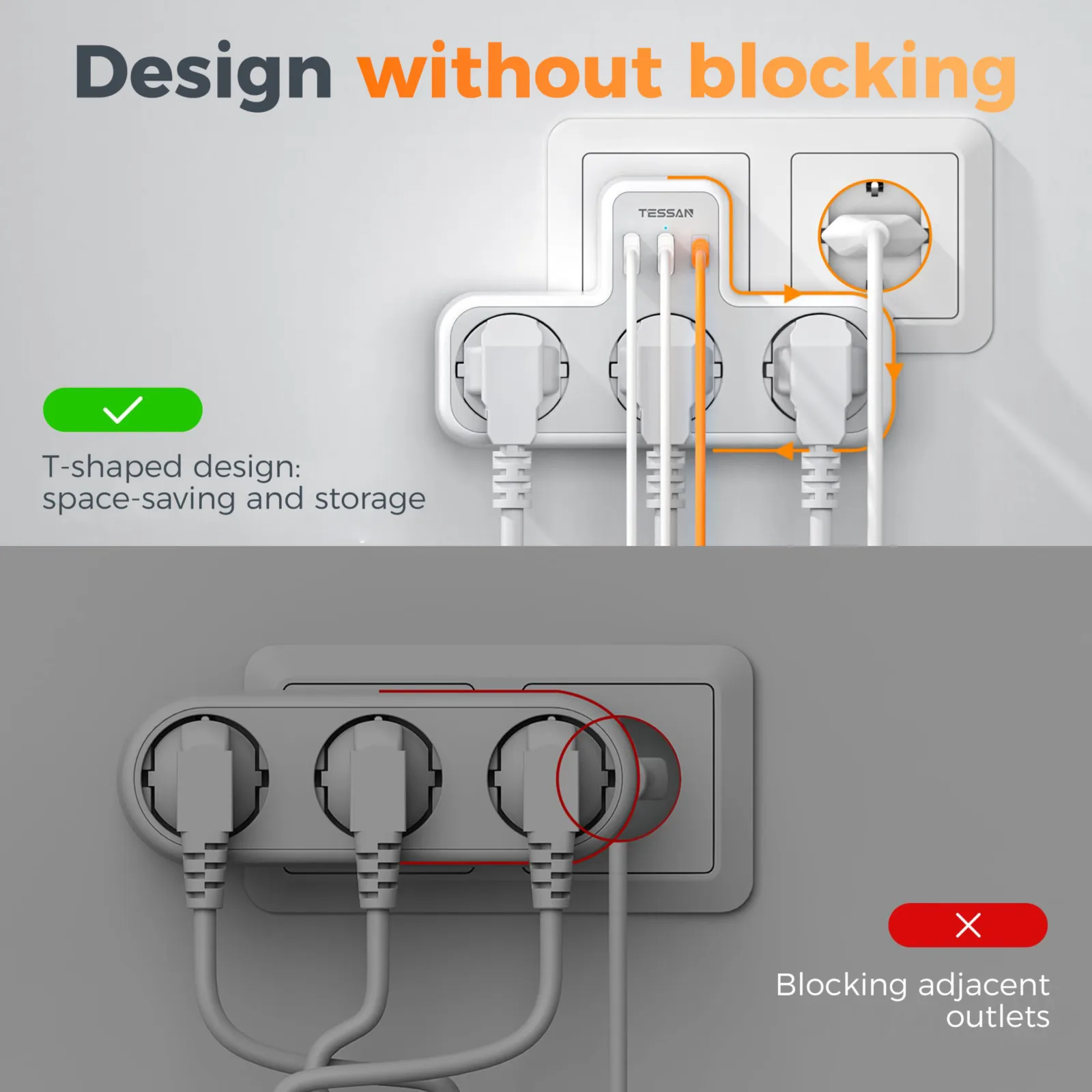 design without blocking switches and parallel sockets. In several parallel plugs, the use of this plug can be extended to 3 other plugs without preventing the use of the original plug.