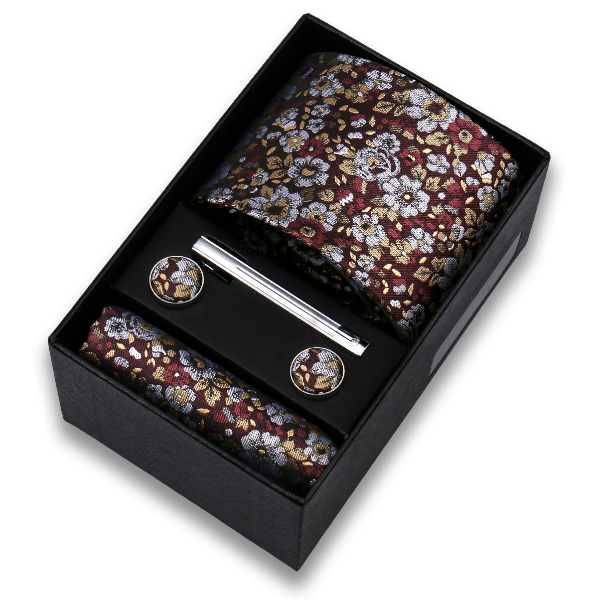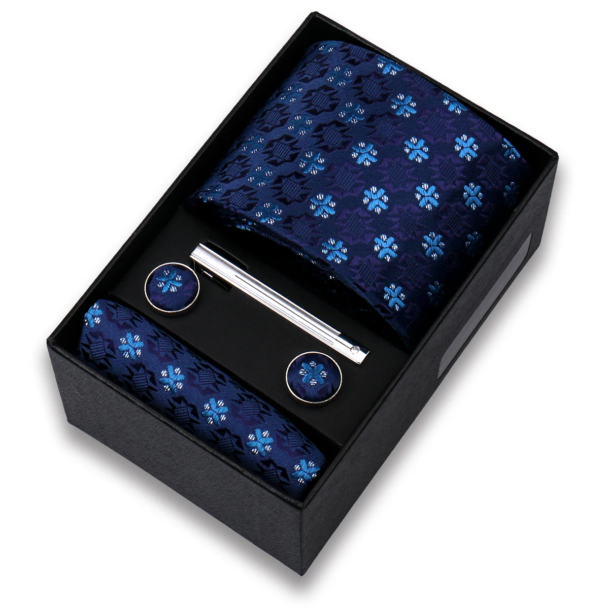 Set includes necktie, pocket square, cufflinks, tie clip, black gift box