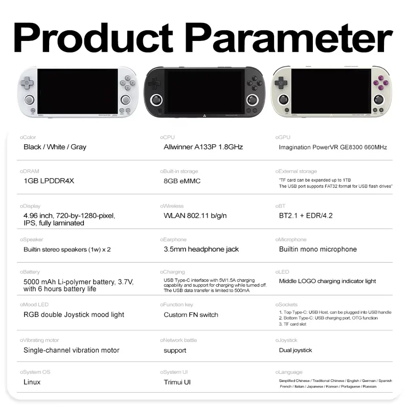 SPECIFICATIONS Battery Capacity[mAh]: 5000 Brand Name: TRIMUI Category: Handheld Game Players Certification: CE Charging Interface Type: Type-C Choice: yes Color Display: Yes Communication: Wi-Fi Depth[mm]: 190 Display Size: 4.95‘’ Expandable storage: Up to 256GB External Controller Interface: Type-C Games Type: Retro Games Games included: 10000 + Height[mm]: 81 Operating System: Linux Origin: Mainland China Package: […]