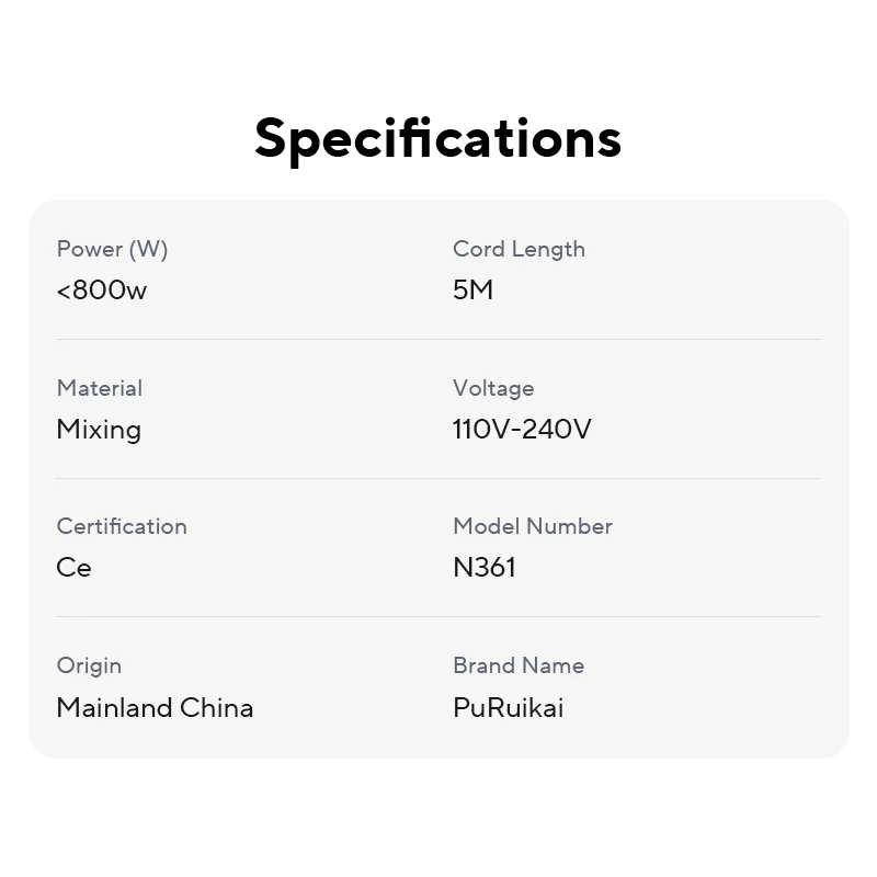 SPECIFICATIONS Brand Name: PuRuikai Certification: ce Cord Length: 5M Hign-concerned Chemical: None Material: mixing Model Number: N361 Origin: Mainland China Power (W): <800W Voltage: 110V-240V