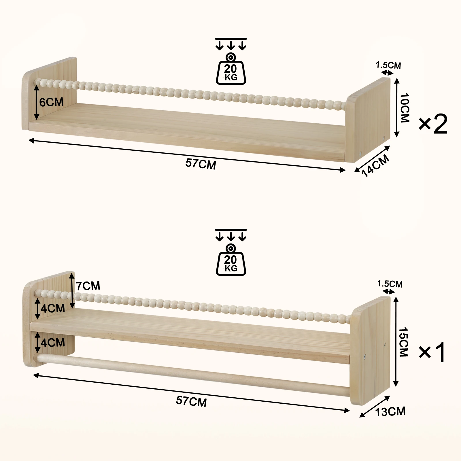 Set of 3 floating shelves: this children’s wall shelf set consists of 3 shelves made of solid wood, which can be attached vertically or horizontally side by side or separately to the wall. One of them is equipped with a hanging bar to expand the storage space and thus save space and make the most of the wall space