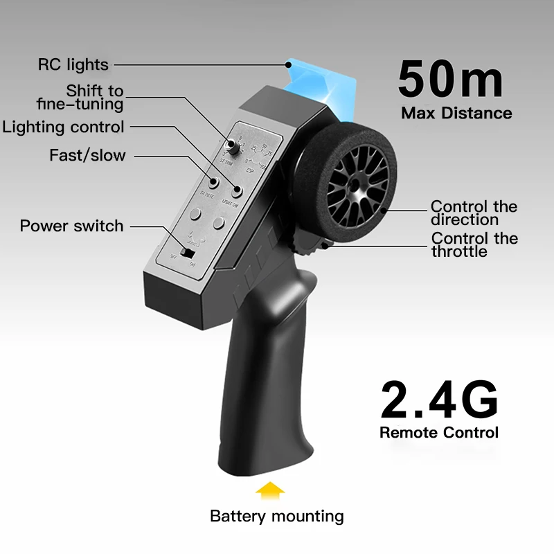 ● Functions: Forward, backward, left turn, right turn, proportional remote control, two-stage transmission, remote control to control headlights